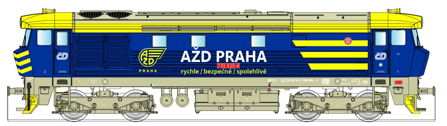 | dieselová lokomotiva v barevném schematu „AŽD“ |