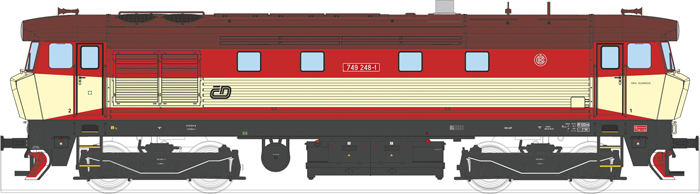 | dieselová lokomotiva červená-slonová kost, hnědá střecha |