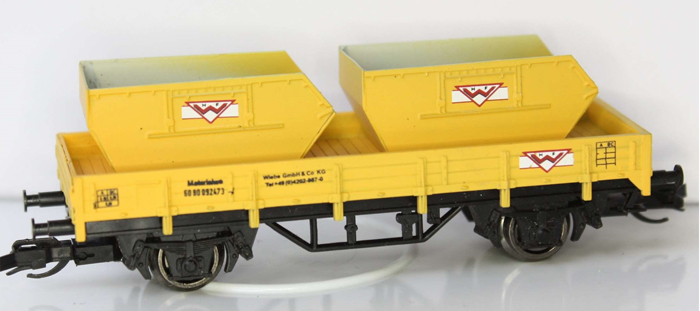 | nízkostěnný pracovní vůz žlutý s kontejnery na stavební suť |
