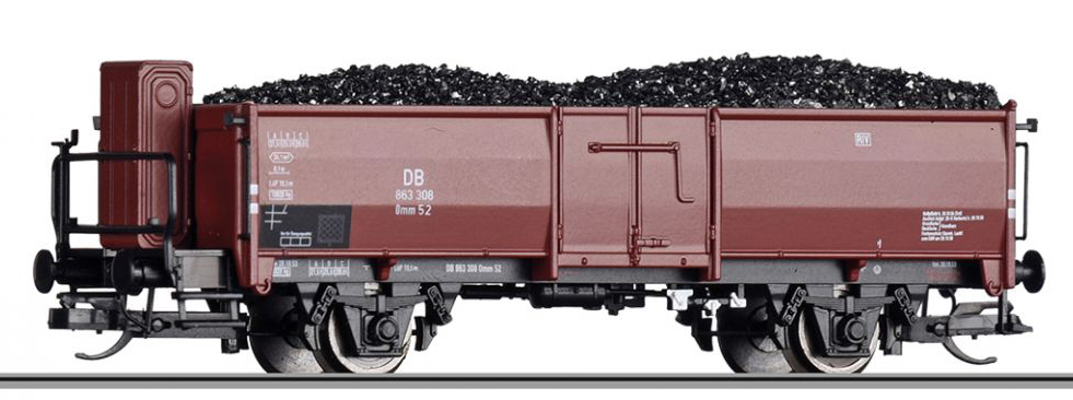 otevřený nákladní vůz červenohnědý s brzdařskou budkou ložený uhlím