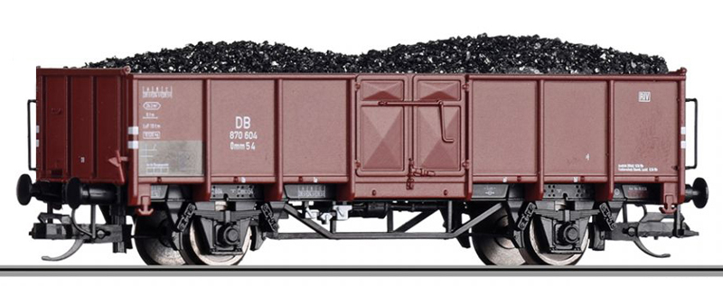 otevřený nákladní vůz červenohnědý ložený uhlím