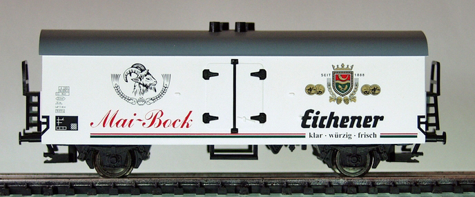 Popis   nákladní chladící vůz bílý s šedou střechou „Eichener Mai Bock“