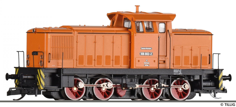 | dieselová lokomotiva oranžová, šedý rám a pojezd, červená kola |
