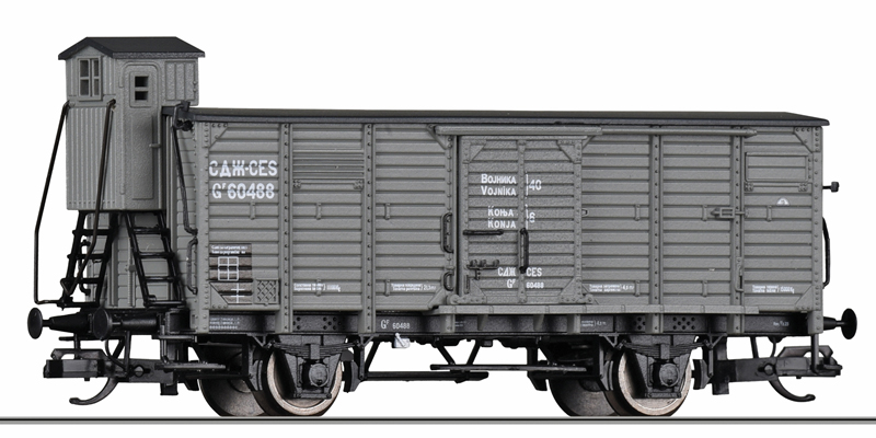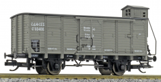 krytý nákladní vůz zelenošedý s černou střechou a s brzdařskou budkou