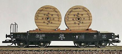 | nákladní plošinový vůz černý se dvěma kabelovými cívkami |