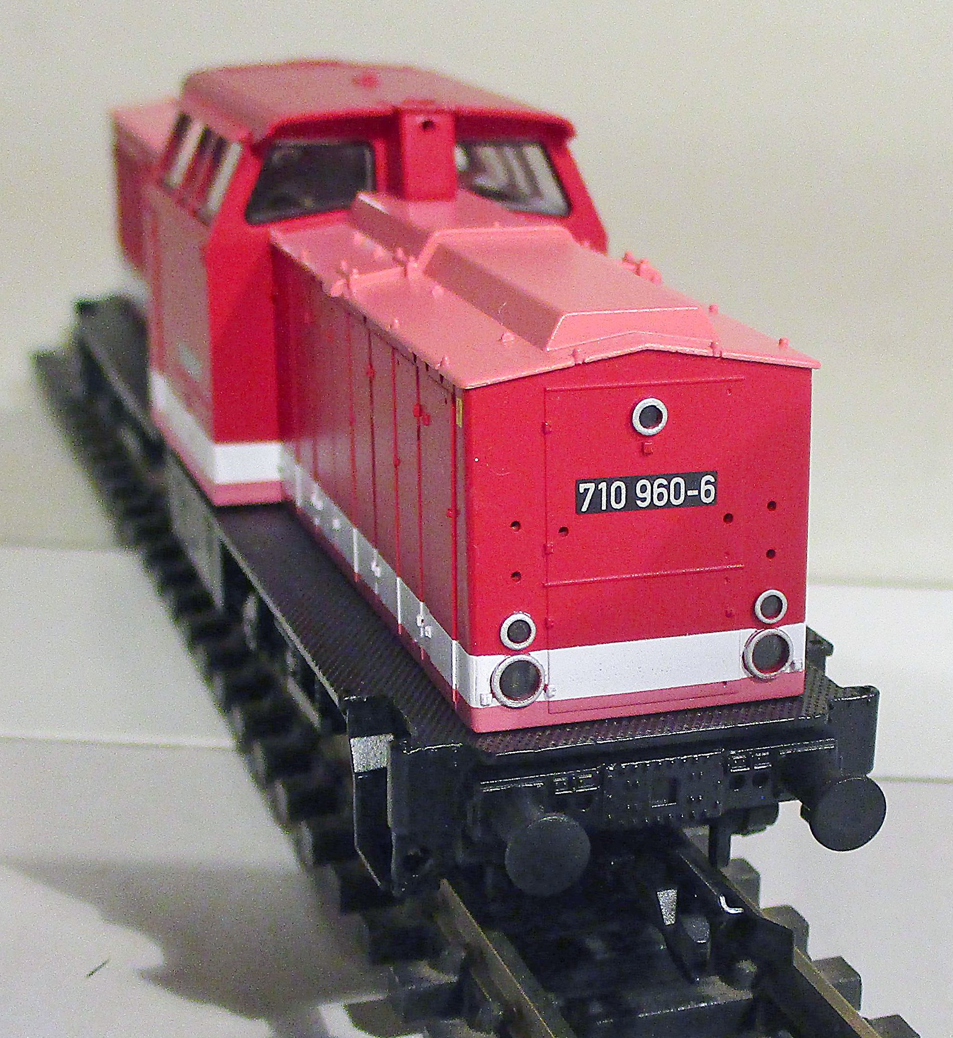 | dieselová lokomotiva červená s bílým proužkem a s pomocným pohonem |