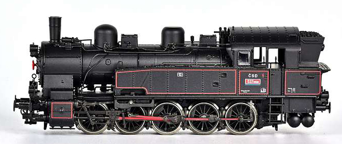 | parní lokomotiva černá s černým pojezdem, červené lemování |