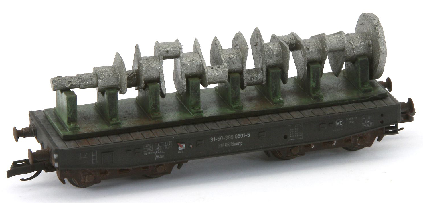 | plošinový nákladní vůz černý nákladem vačkového hřídele |