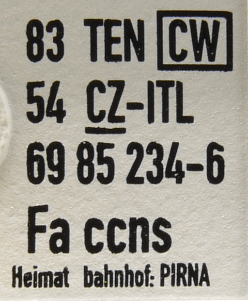 | • 83 54 69 85 234-6 | → | nákladní, s podvozky, soukromý vůz, pro mezinárodní dopravu dle zvláštních úmluv |