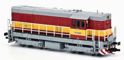 | dieselová lokomotiva červená s výstražným pruhem, šedá střecha, rám a pojezd |