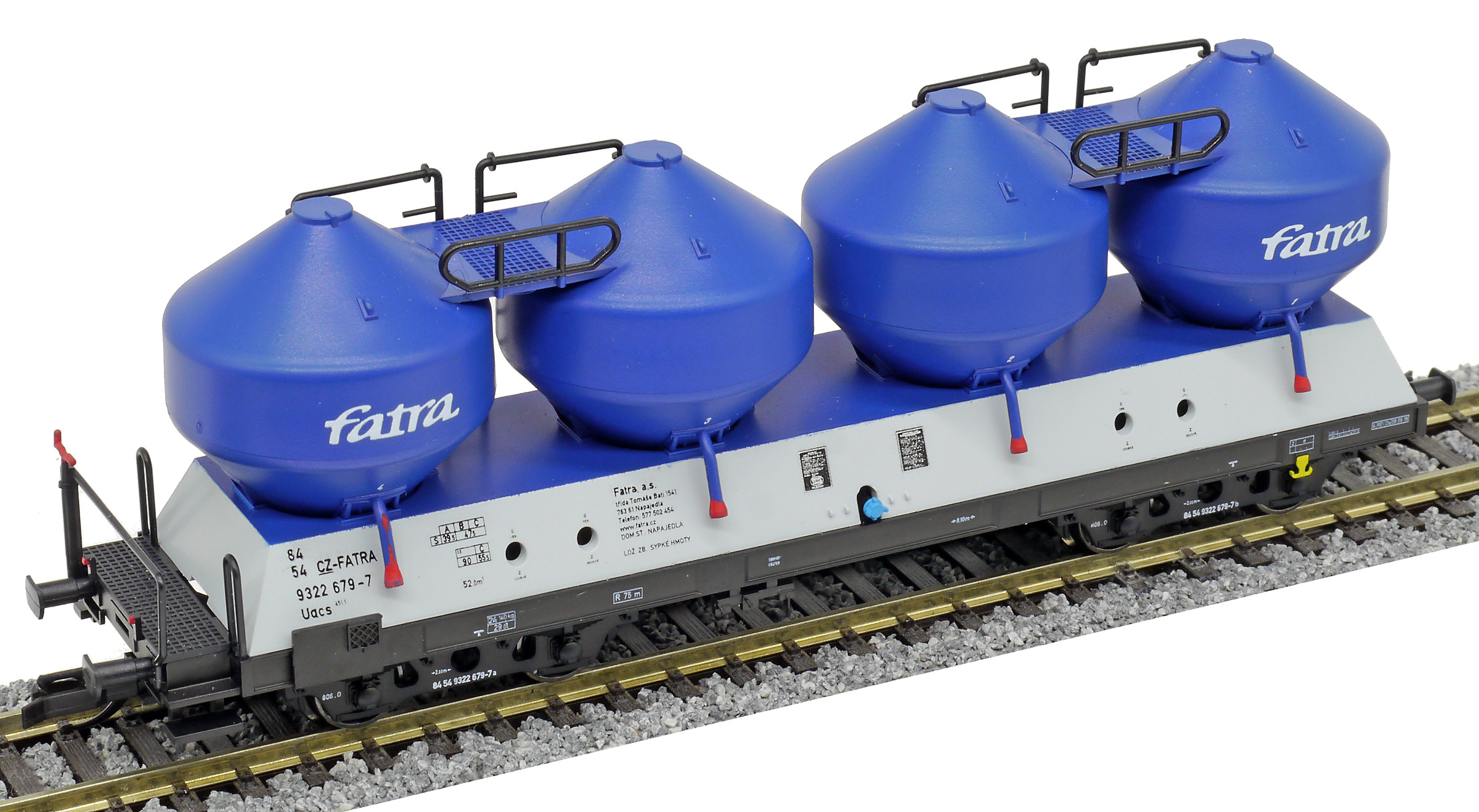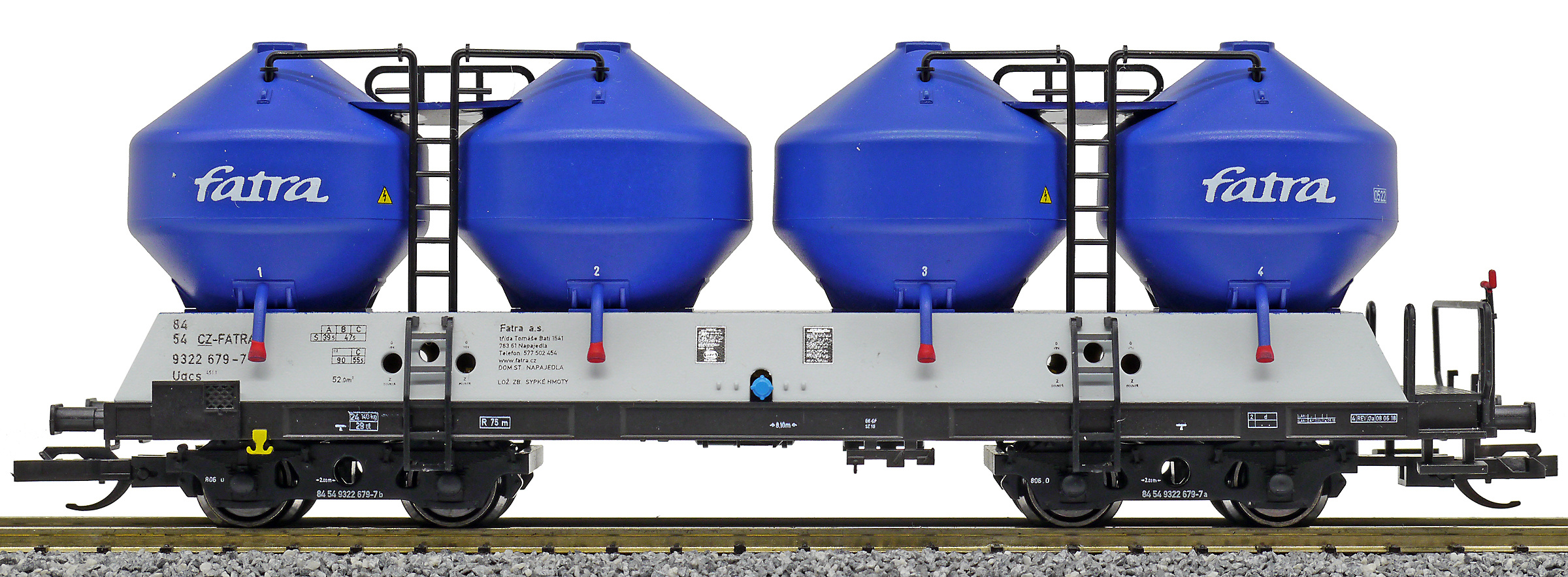 | nákladní samovýsypný vůz šedý-modrá skříň s modrými nádobami a s logem „Fatra“ |