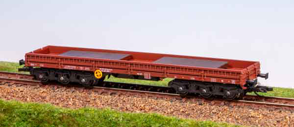 | nákladní nízkostěnný vůz červenohnědý ložený ocelovými deskami |