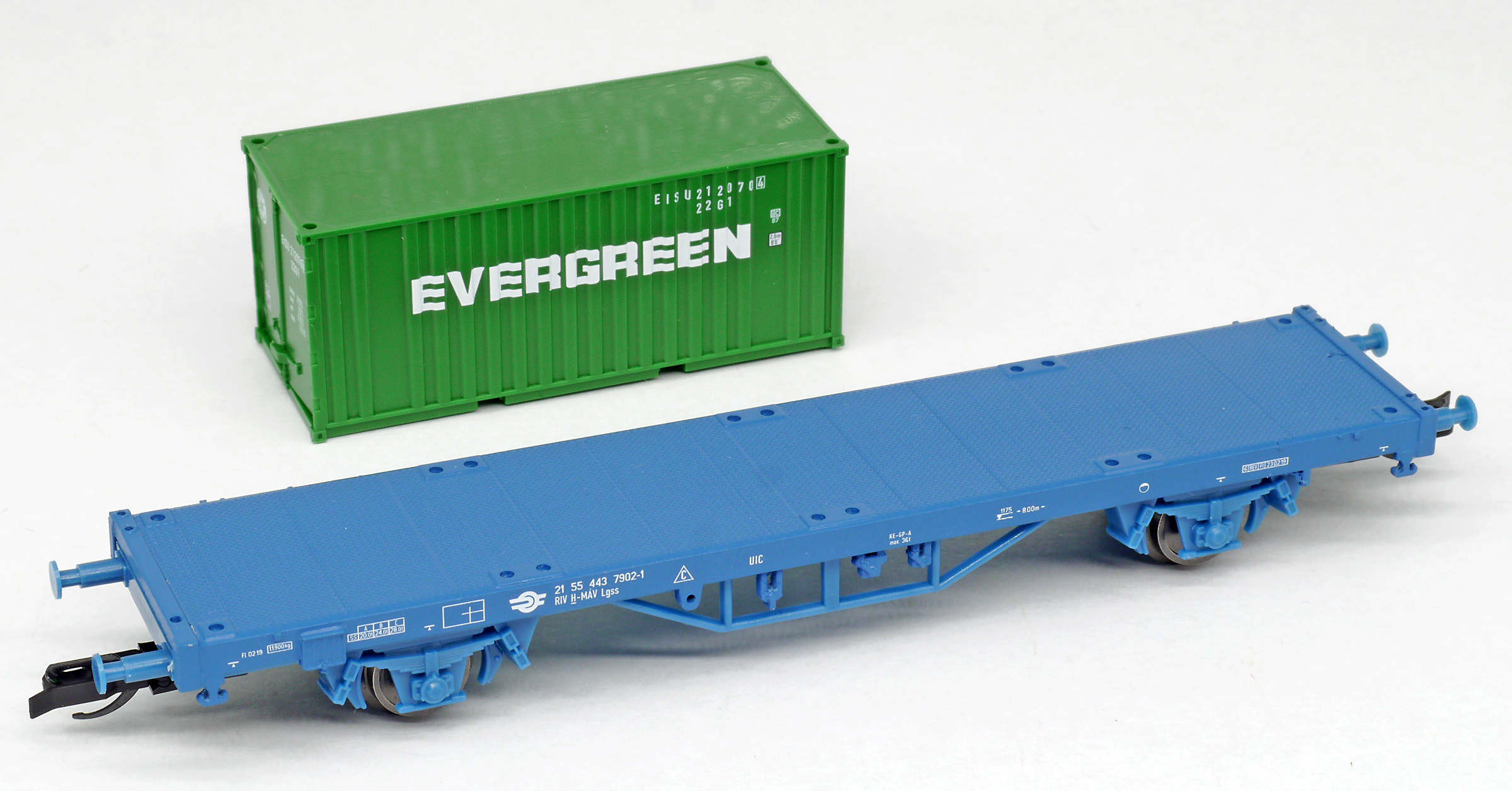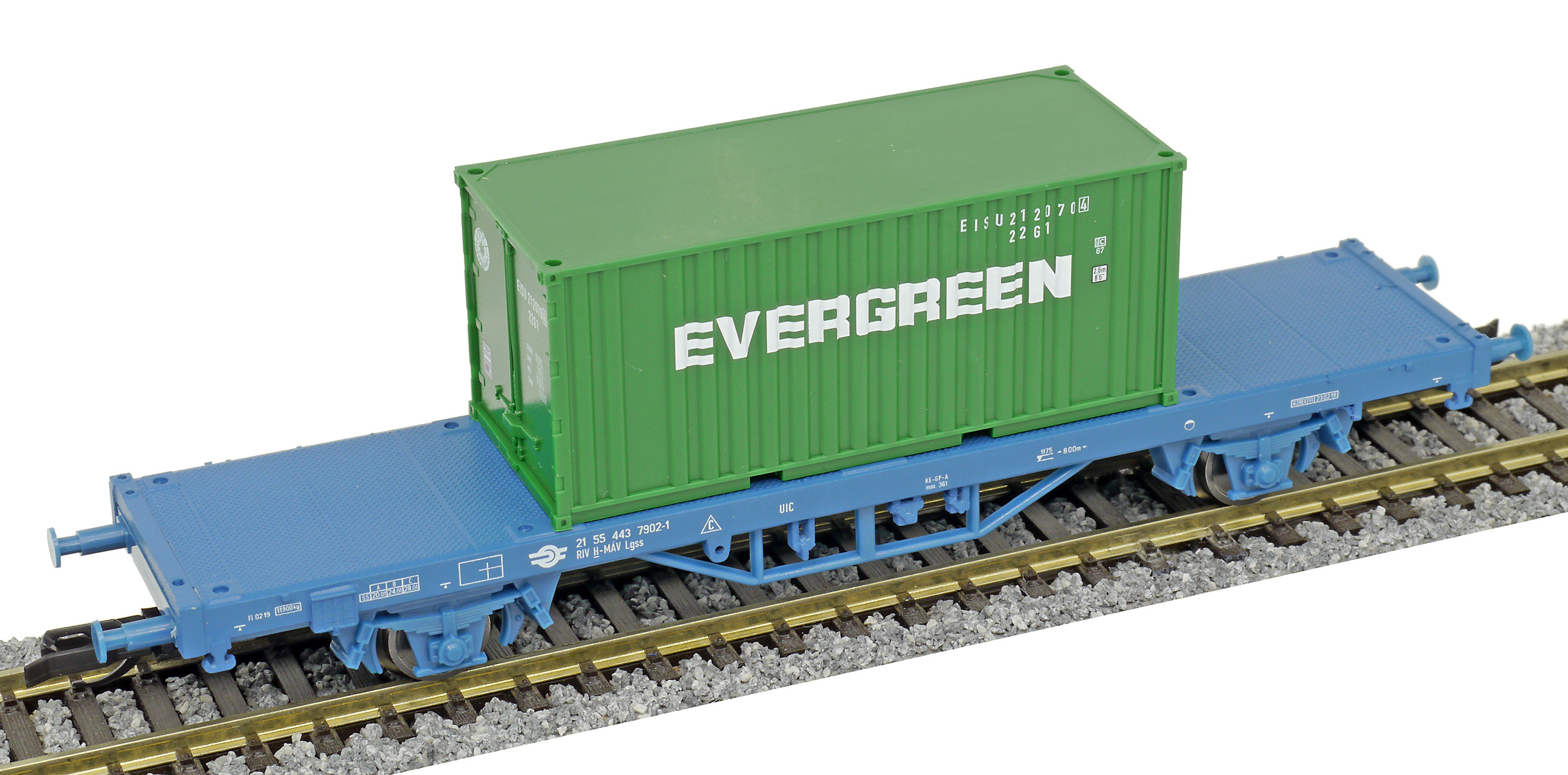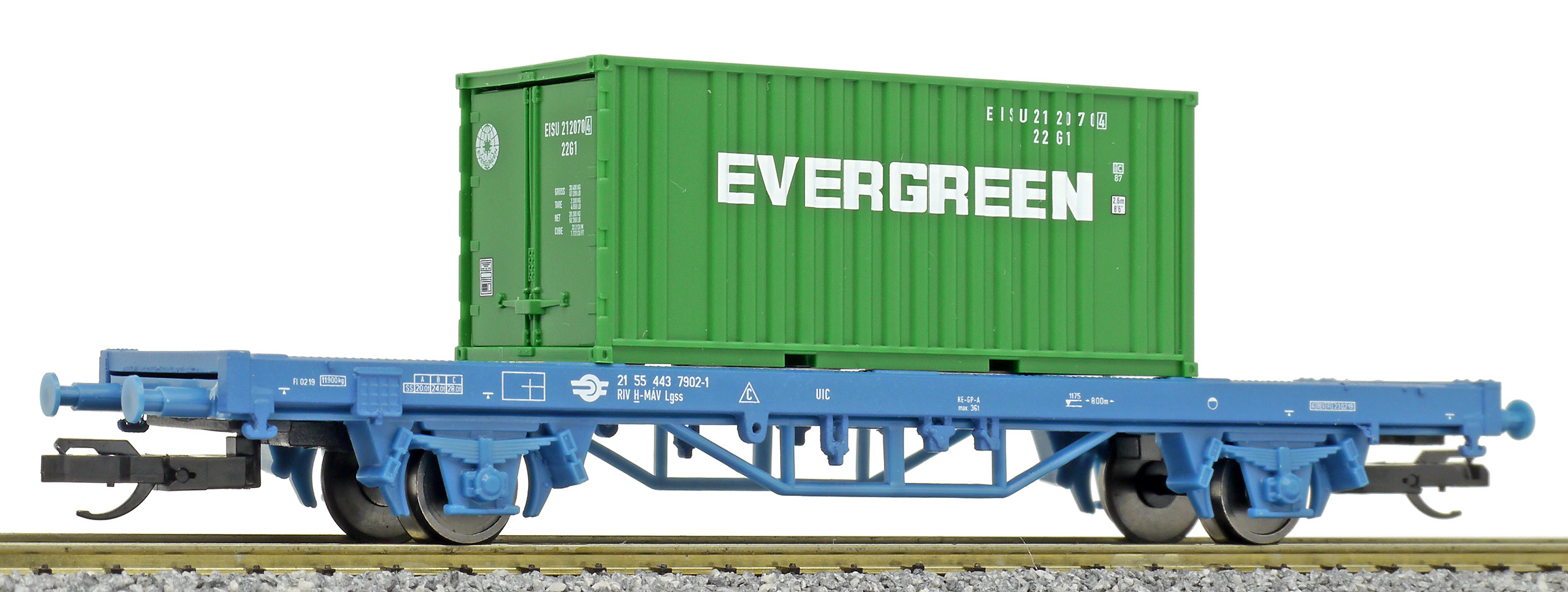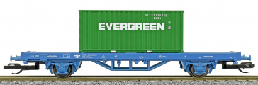 | plošinový nákladní vůz modrý s kontejnerem 20' „EVERGREEN“ |