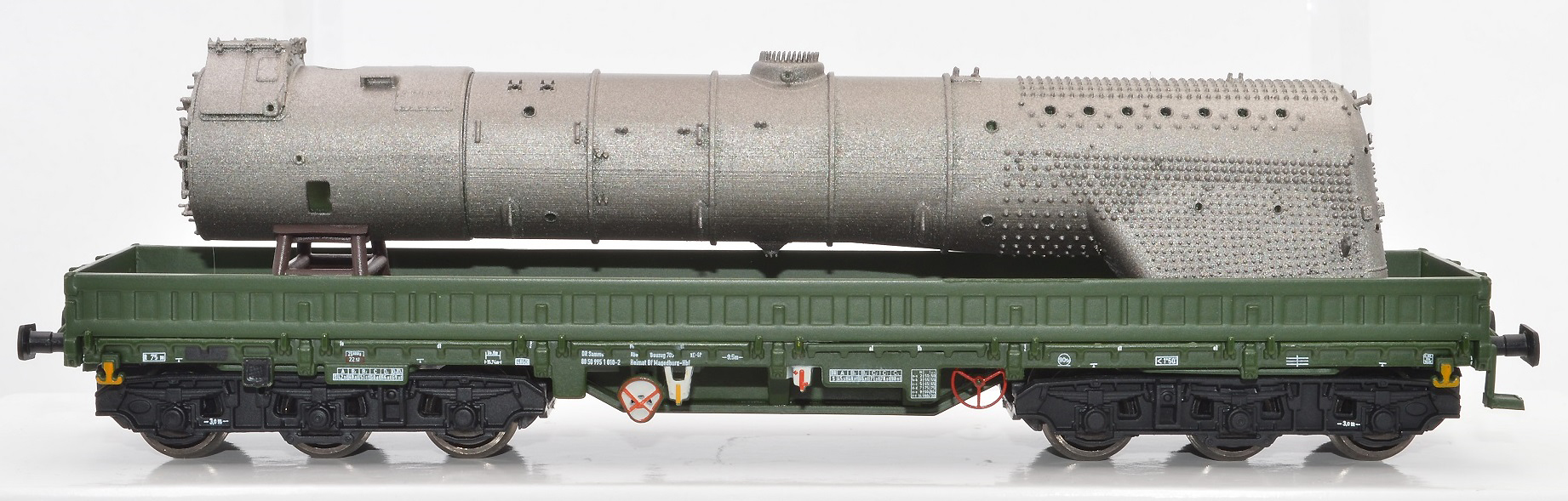 | nízkostěnný nákladní vůz zelený do pracovního vlaku s nákladem kotle lokomotivy BR 41 |