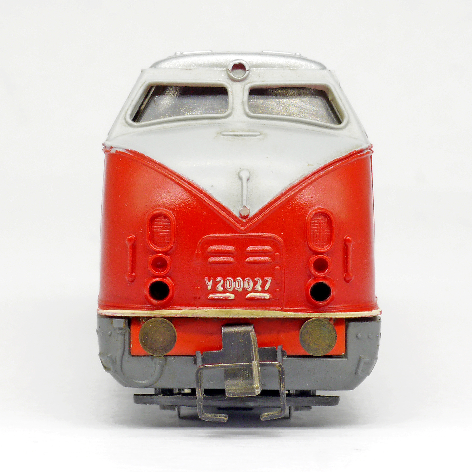| dieselová lokomotiva červená-světle šedá s tmavě šedým rámem |