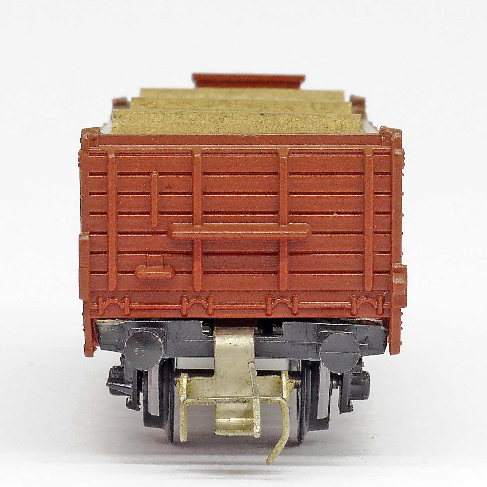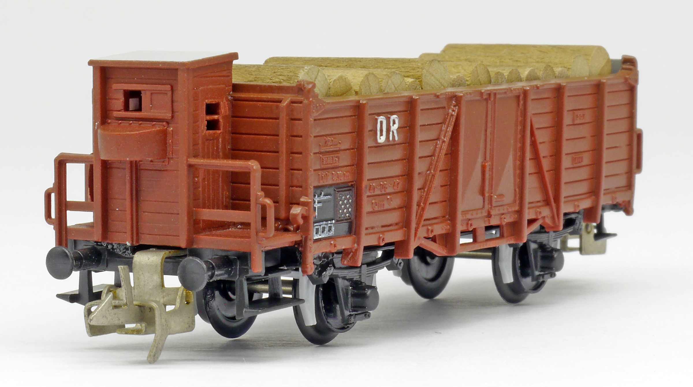 | otevřený nákladní vůz červenohnědý s brzdařskou budkou ložený kulatinou |
