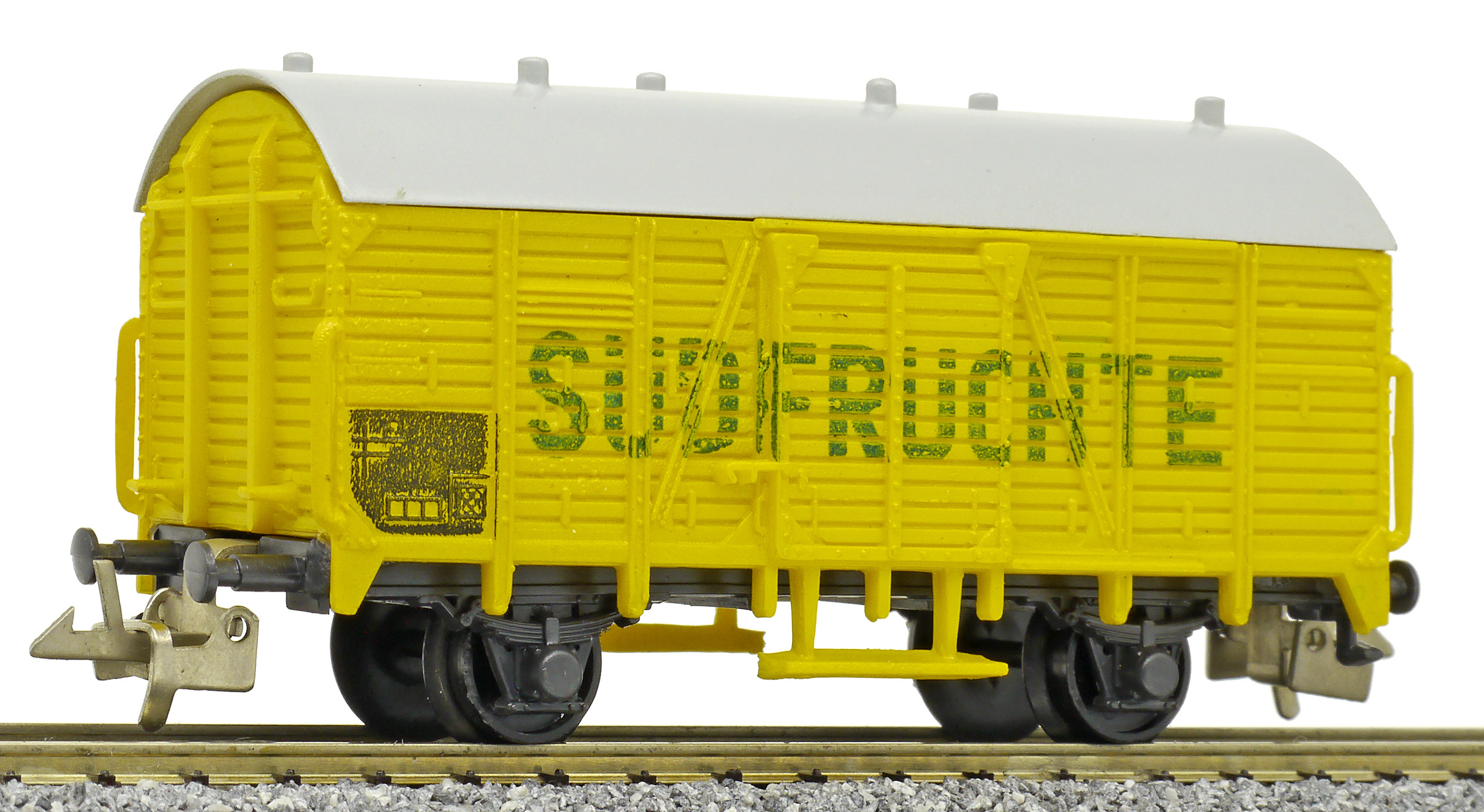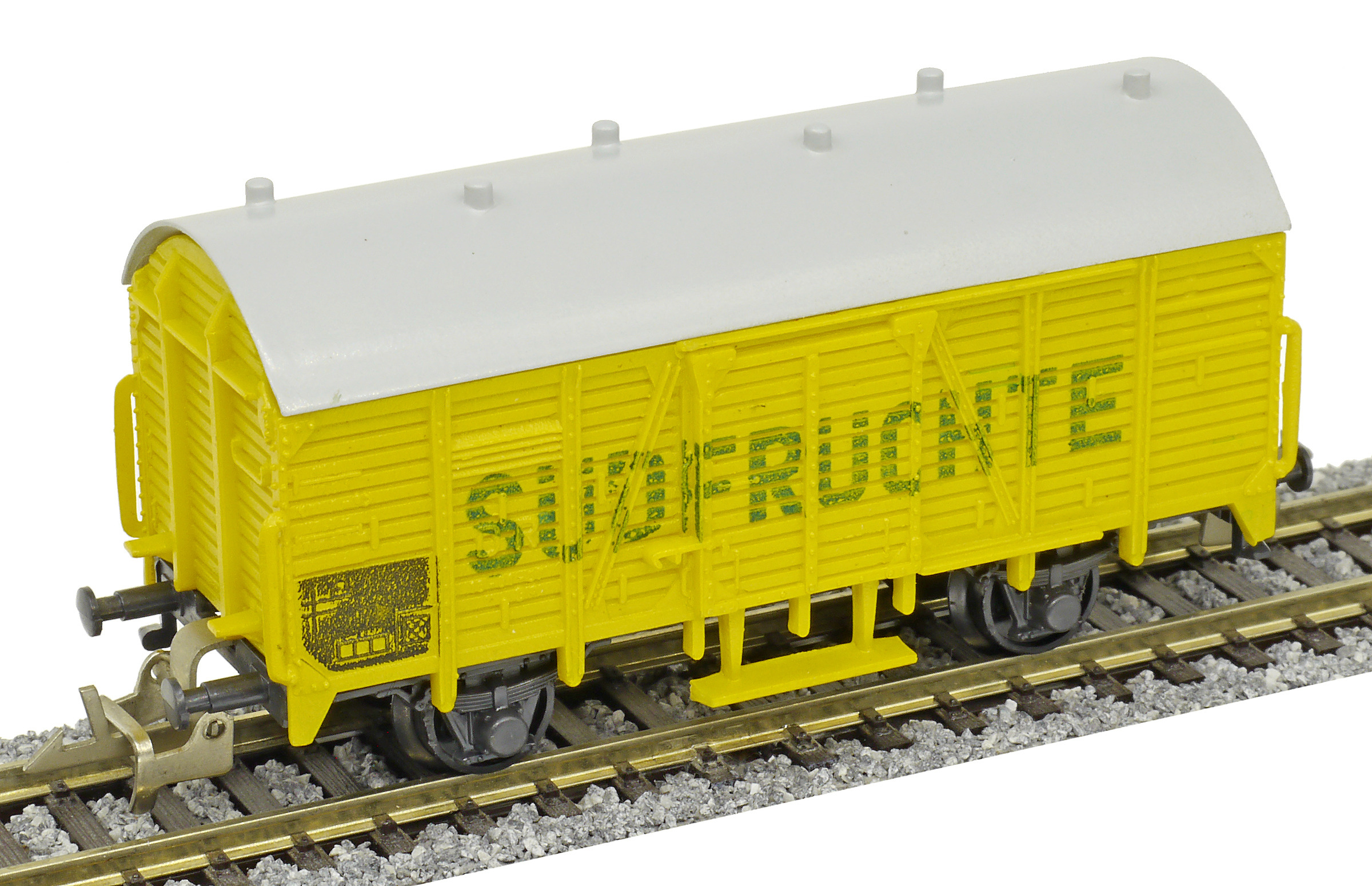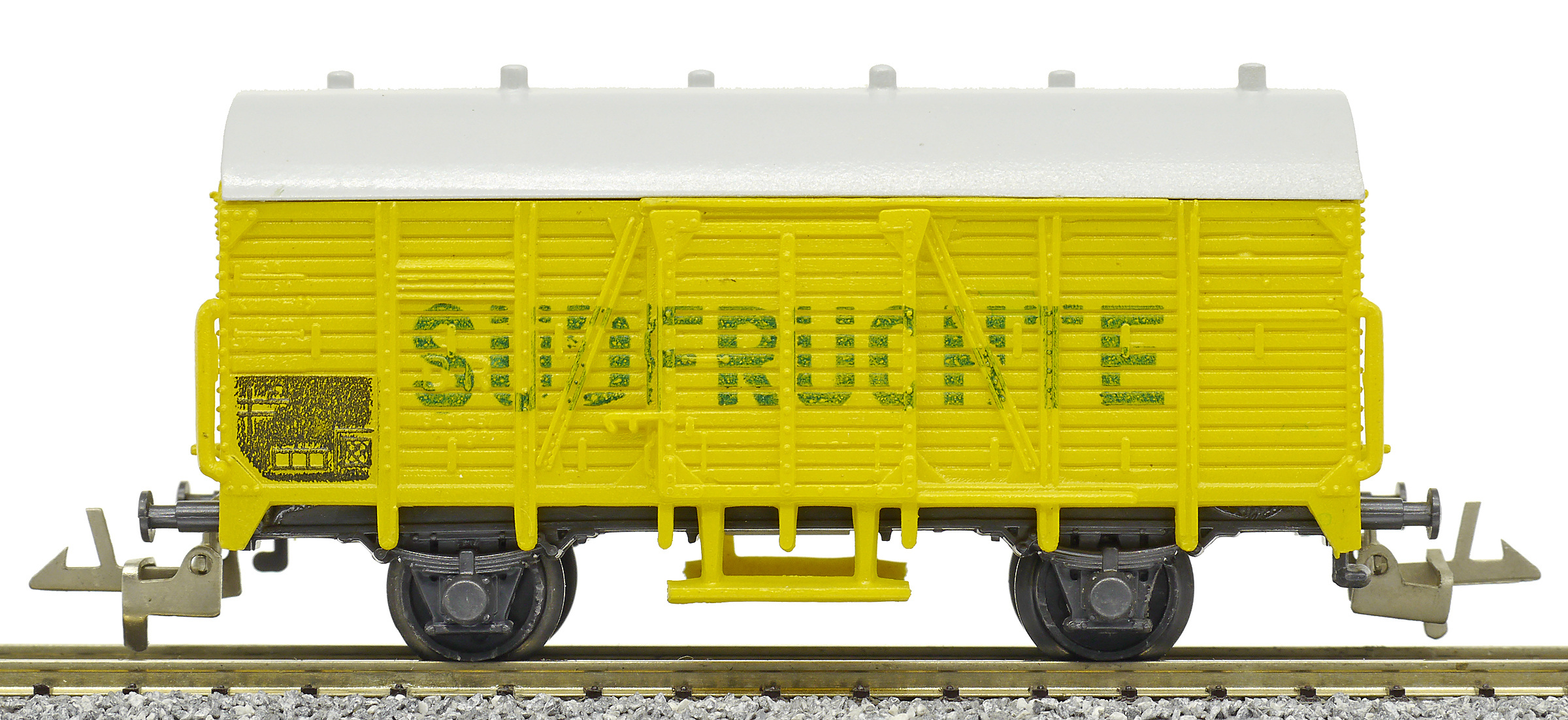 | nákladní chladící vůz žlutý s šedou střechou „Südfrüchte“, bez brzd |