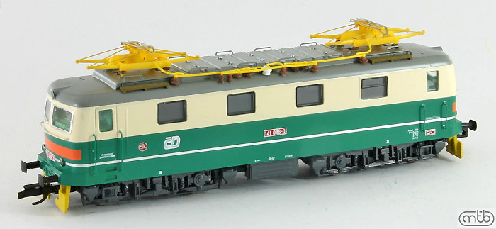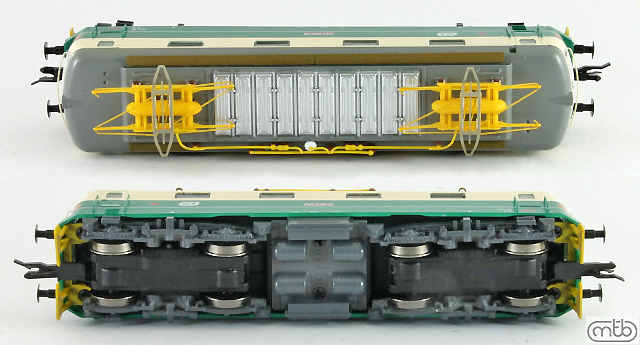 | elektrická lokomotiva zelená-slonová kost, šedá střecha, oranžový výstražný pruh |