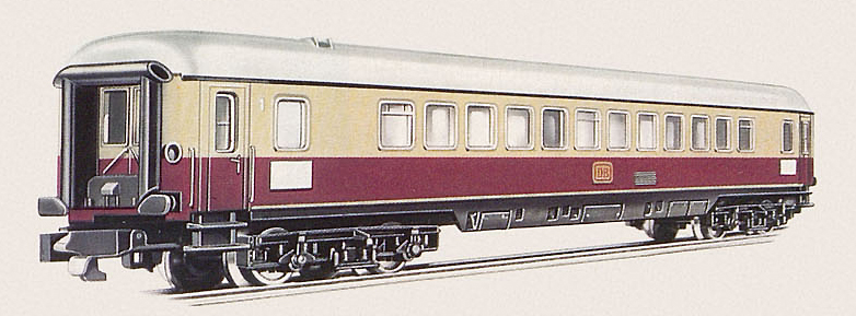 | rychlíkový velkoprostorový vůz vínově červený-slonová kost se světle šedou střechou „TEE“ 1. tř. |