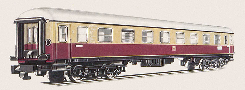 rychlíkový oddílový vůz vínově červený-slonová kost se světle šedou střechou „TEE“ 1. tř.
