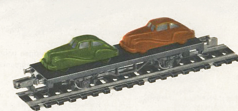 nákladní plošinový vůz červený nákladem dvou osobních vozů
