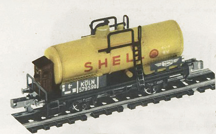 | kotlový vůz žlutý s logem „SHELL“ a s brzdařskou budkou |