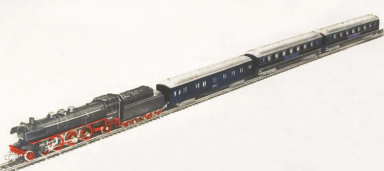 | set parní lokomotivy, jednoho poštovního a dvou rychlíkových vozů „Rheingold“ |