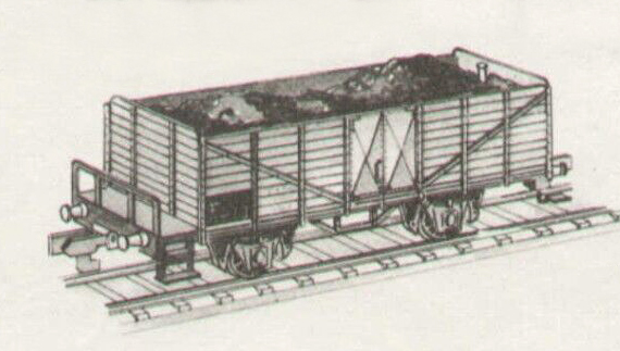 | otevřený nákladní vůz červenohnědý s brzdařskou plošinou ložený uhlím |