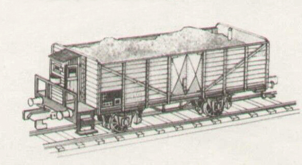 | otevřený nákladní vůz červenohnědý s brzdařskou budkou ložený štěrkem |