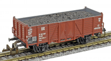 | otevřený nákladní vůz červenohnědý s nákladem uhlí |