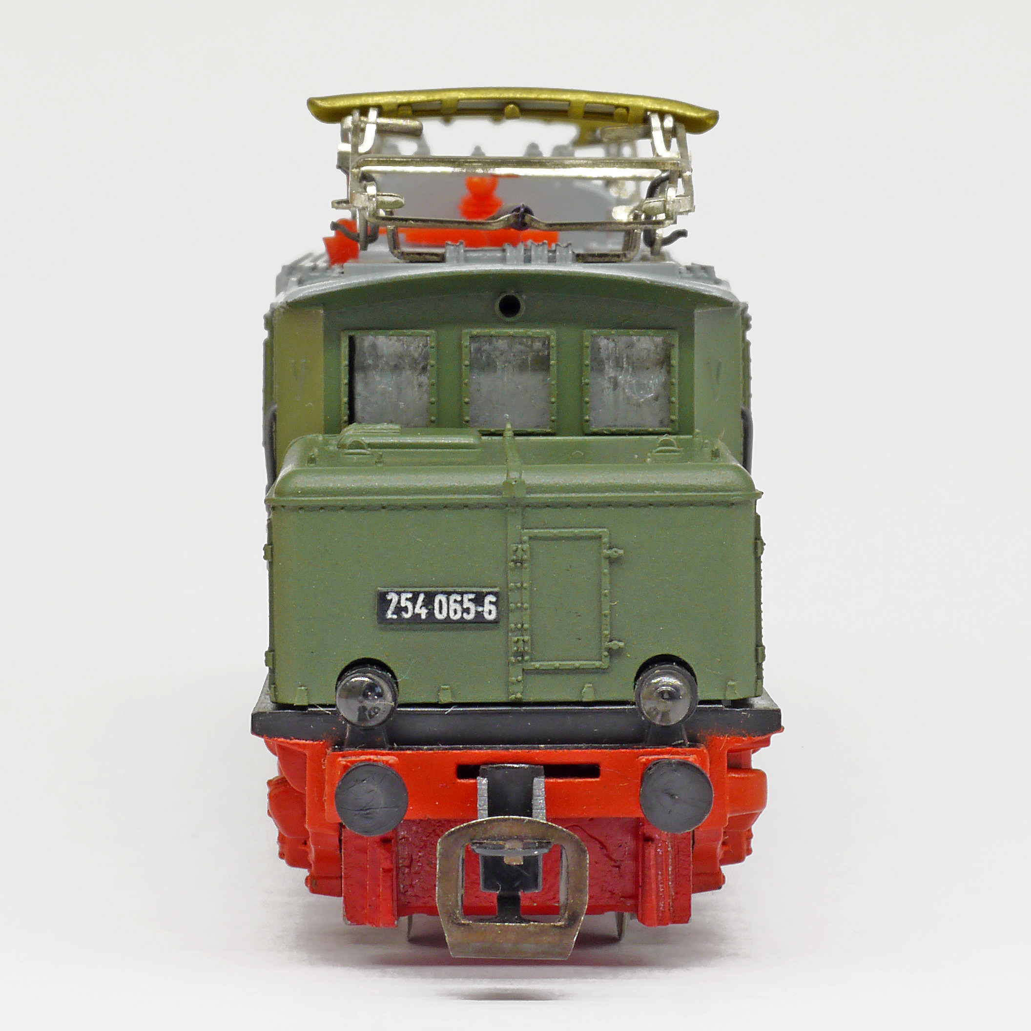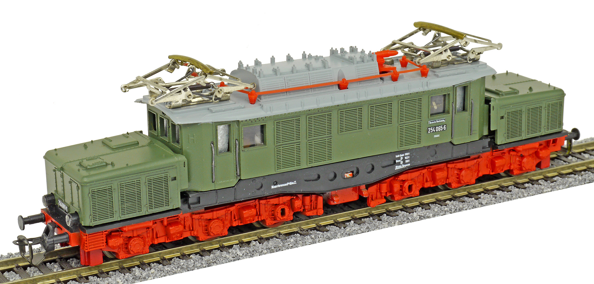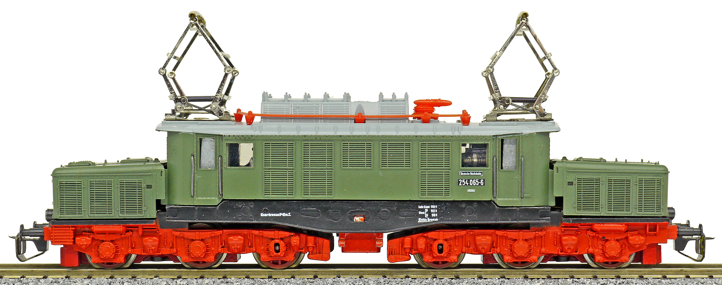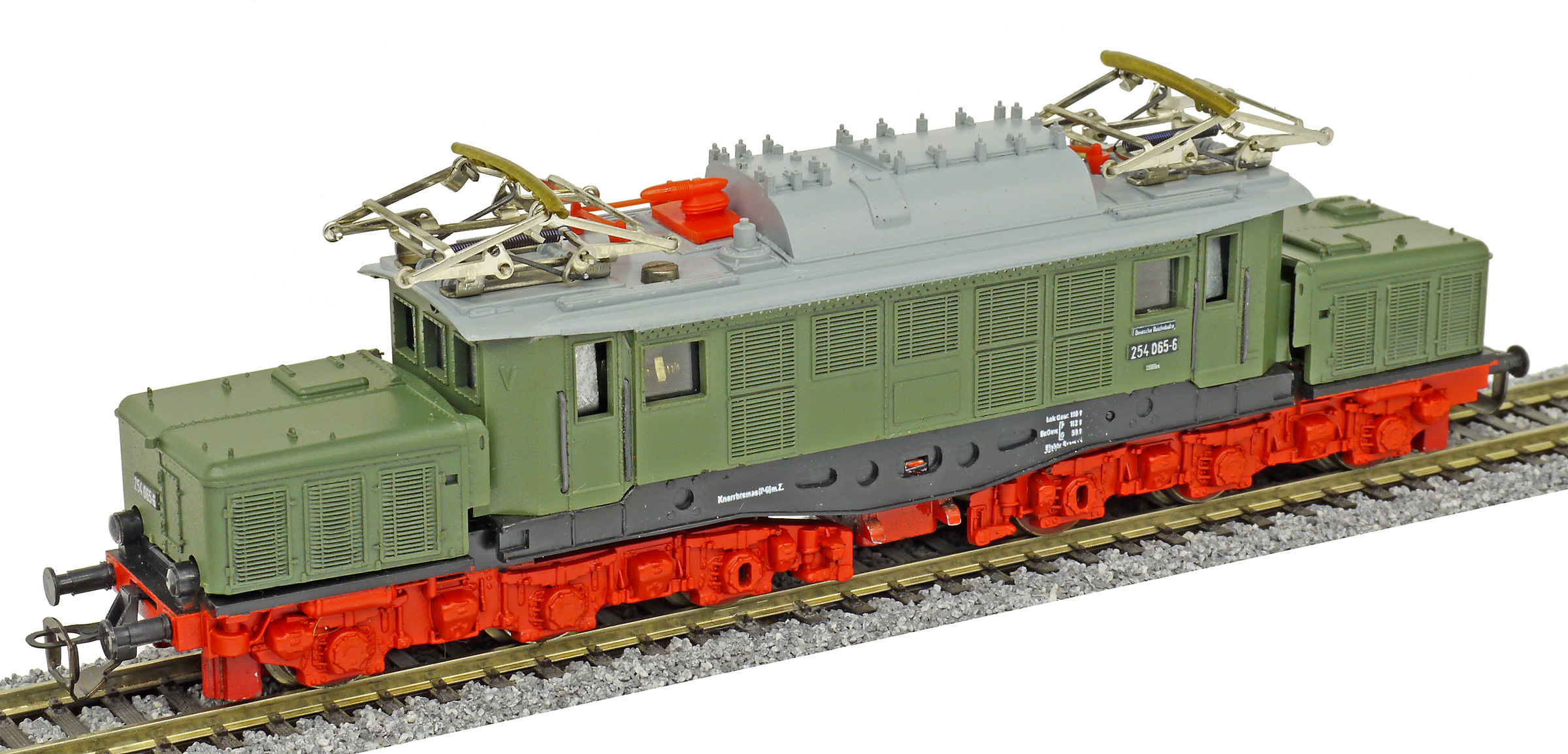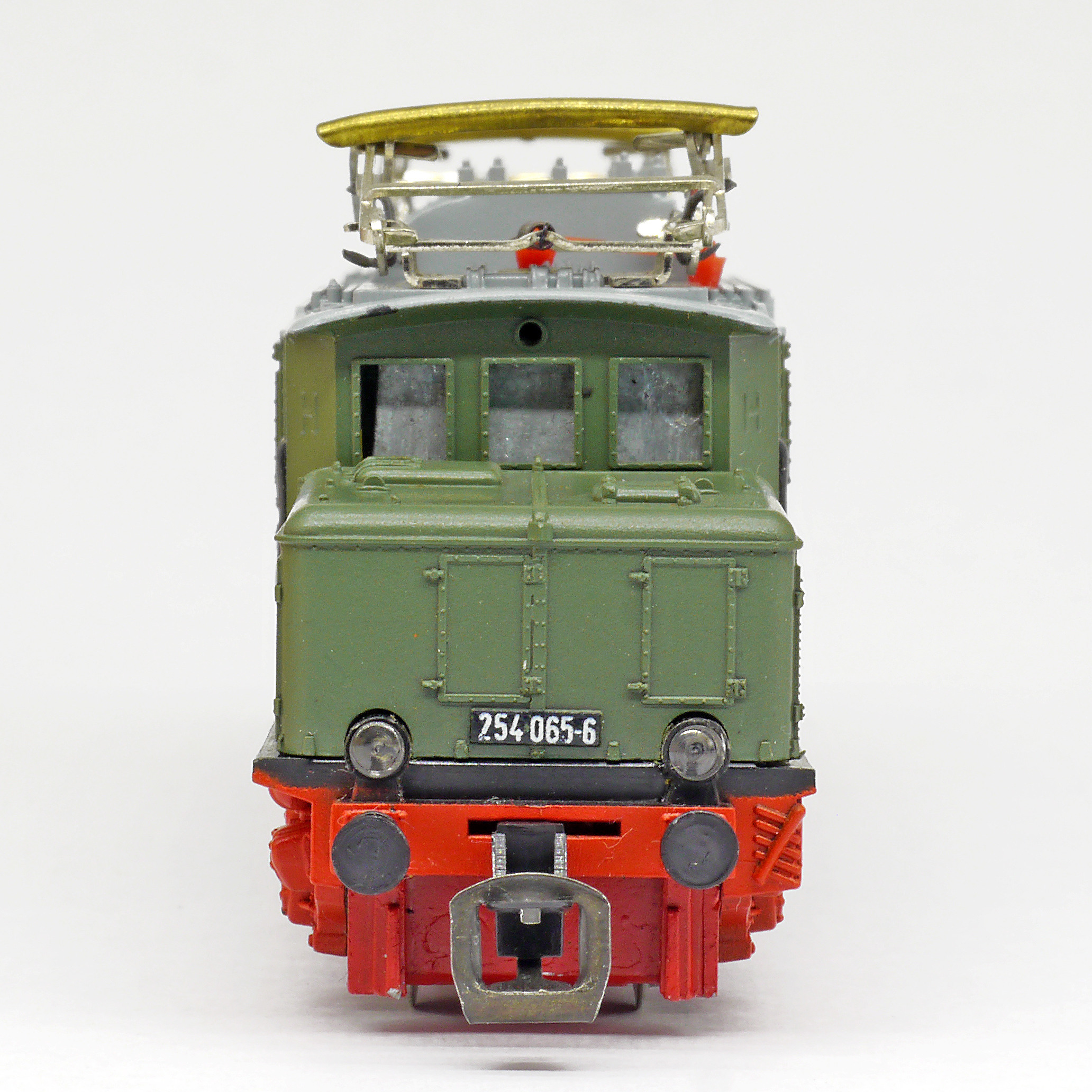 Popis   elektrická lokomotiva zelená s šedou střechou a červenými podvozky