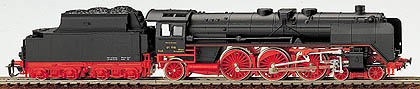 parní lokomotiva černá s červeným pojezdem a s velkými kouřovými plechy