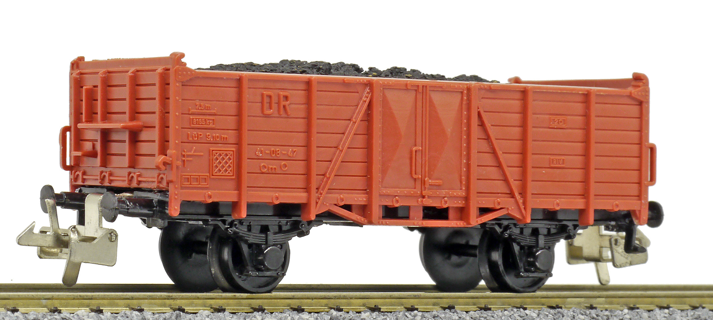 | otevřený nákladní vůz červenohnědý nebo zelený s nákladem uhlí |