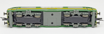 | elektrická lokomotiva zelená se žlutým výstražným pruhem |