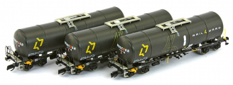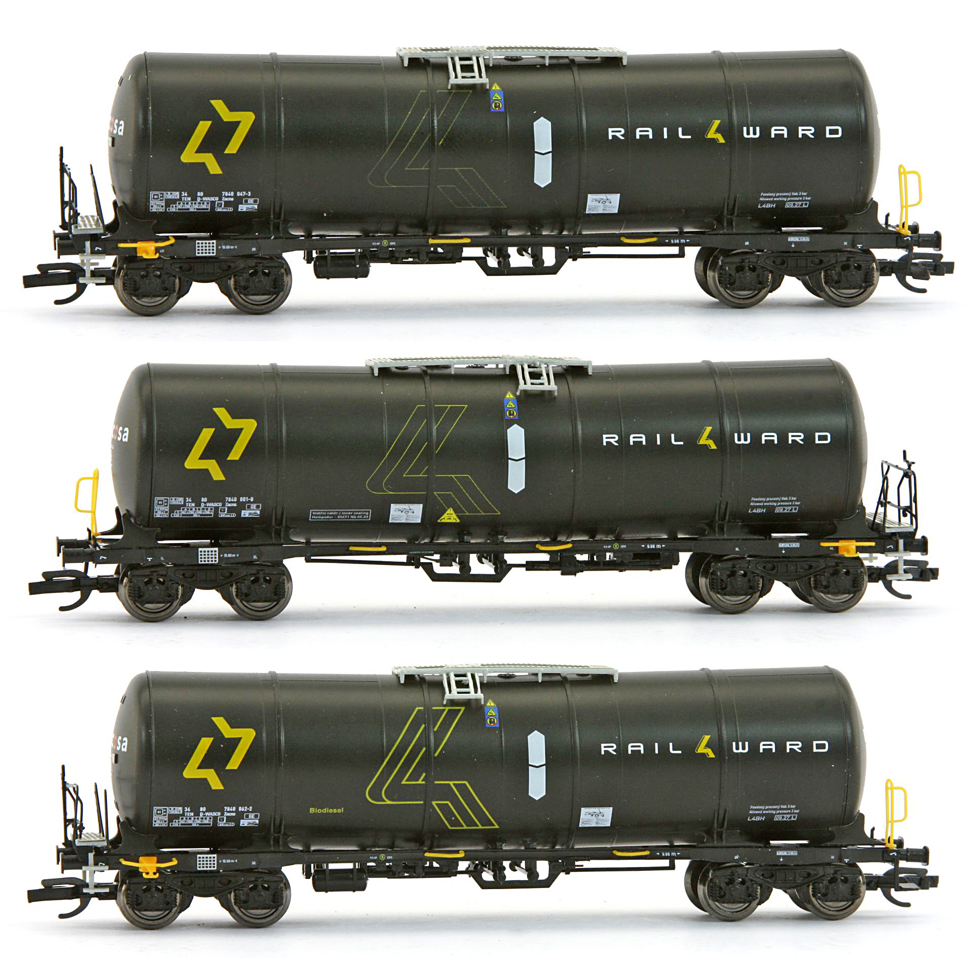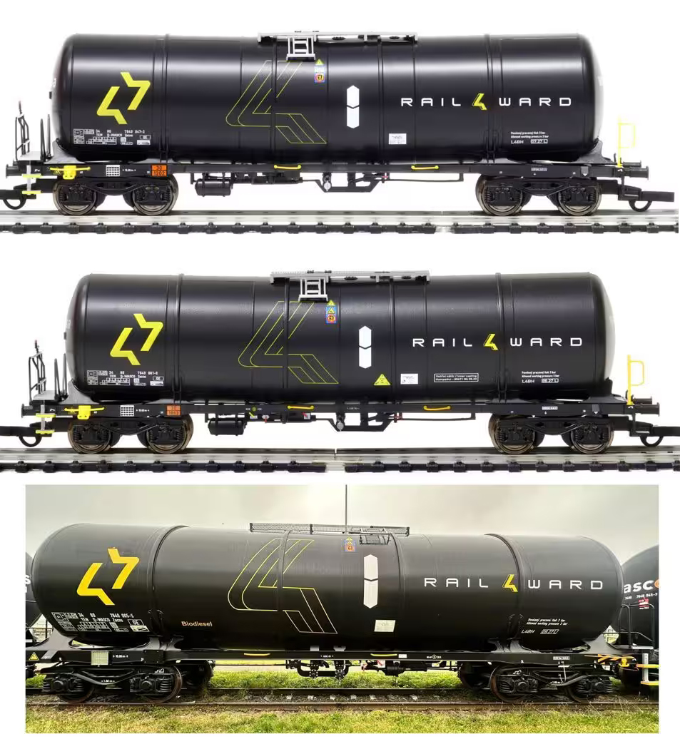 | set tří černých kotlových vozů s logem „RAIL4WARD“ |