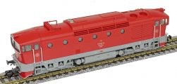 | dieselová lokomotiva červená s tmavě šedým pojezdem |