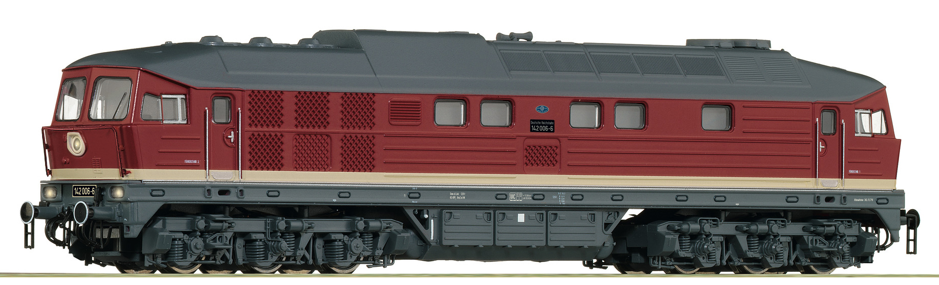 | dieselová lokomotiva červená s krémovým pruhem, s tmavě šedou střechou a pojezdem |
