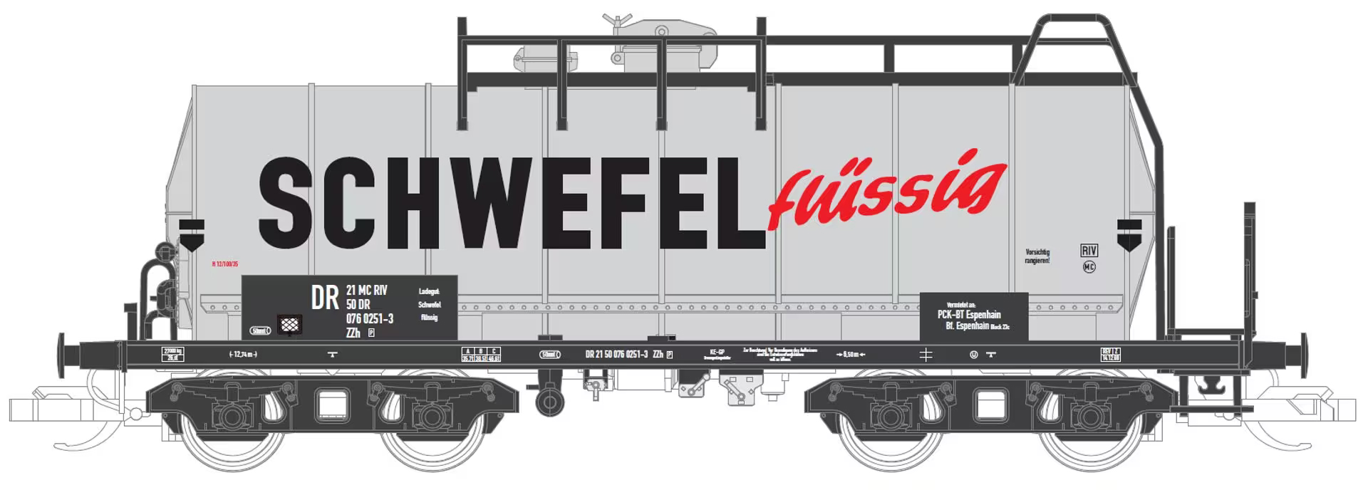 | kotlový vůz stříbrný s nápisem „Schwefel flüssig“ |