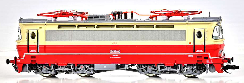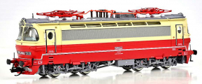 | elektrická lokomotiva v barevné kombinaci červená-krémová, šedá střecha |