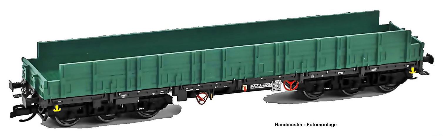 plošinový nákladní vůz s vysokými bočními stěnami zelený, černý rám a podvozky