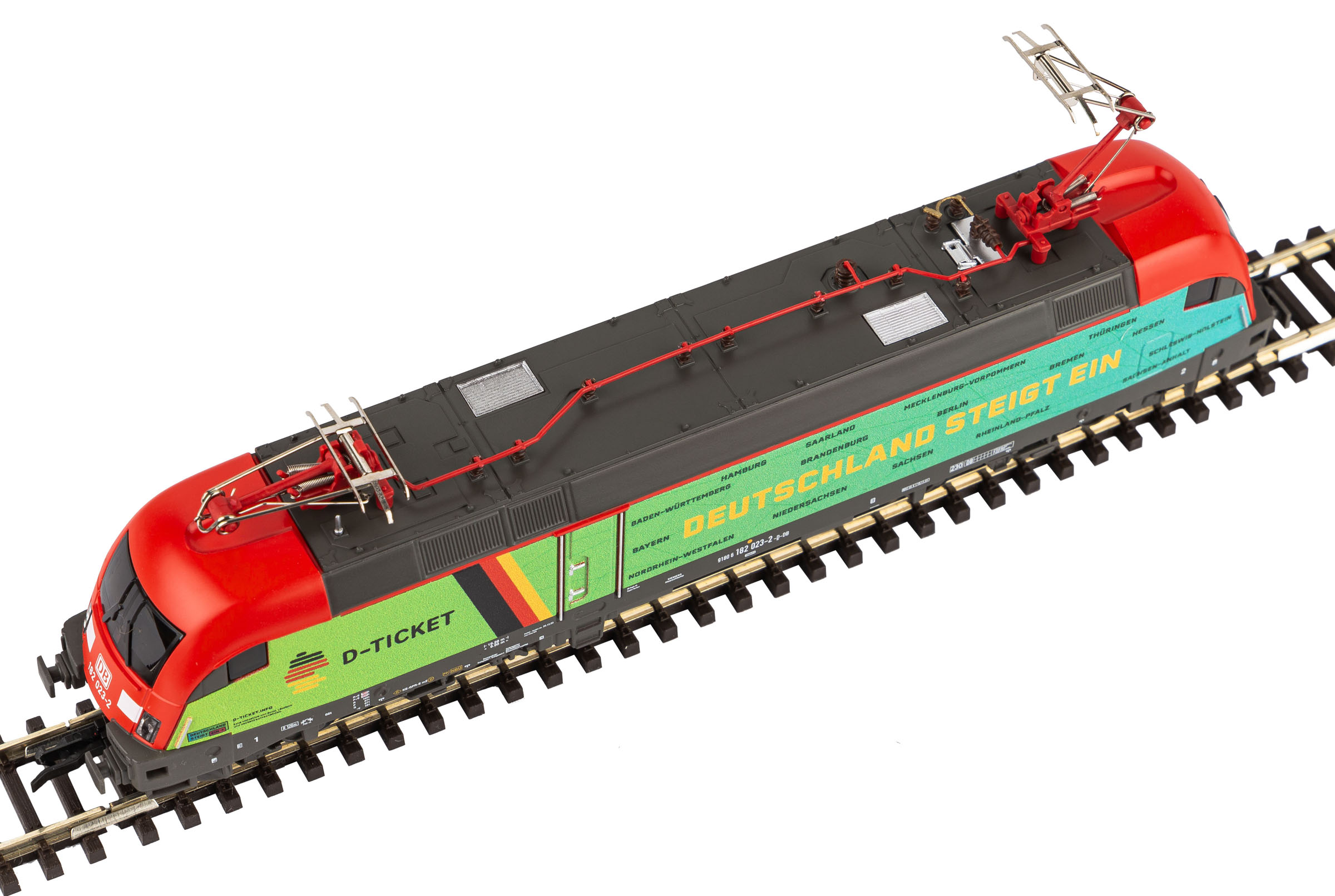 | elektrická lokomotiva zelená-červená s reklamním potiskem „D-Ticket“ |