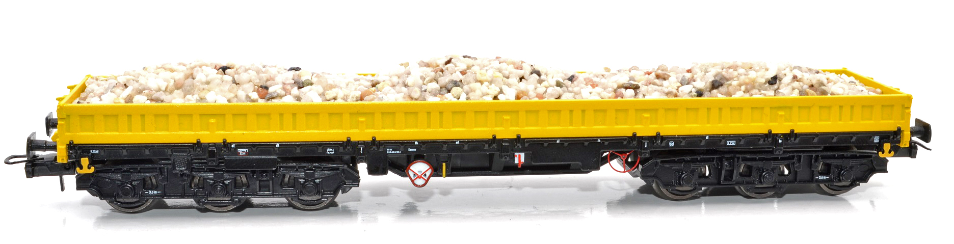 Popis   nízkostěnný nákladní vůz žlutý s černým rámem s nákladem šterku „Bahnbau Gruppe“