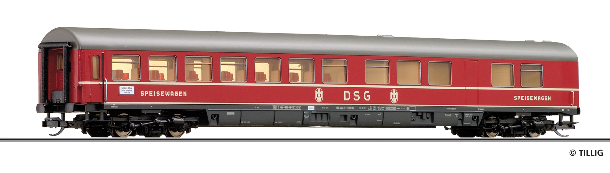 | jídelní vůz červený s tmavě šedou střechou „DSG“ |