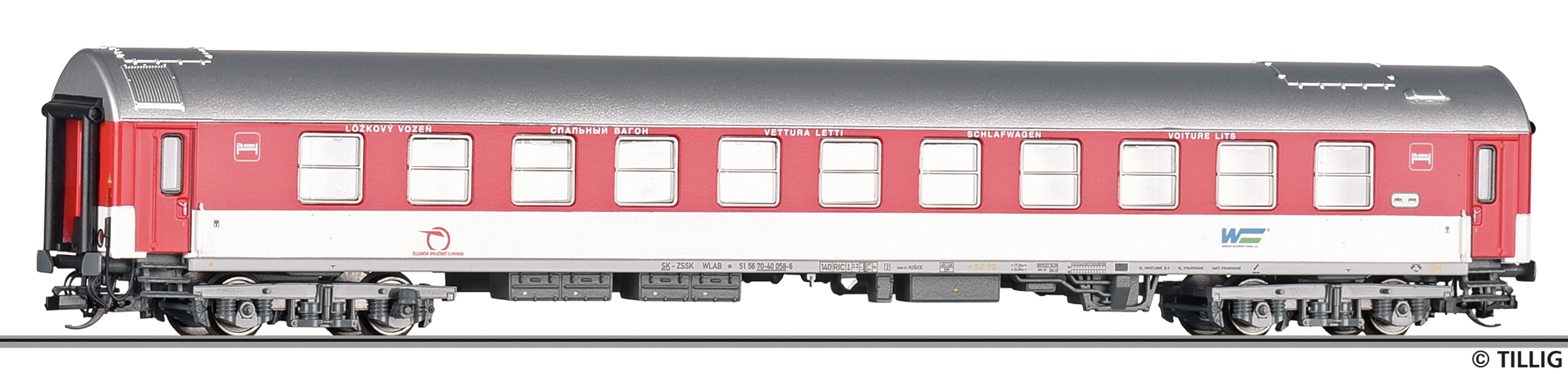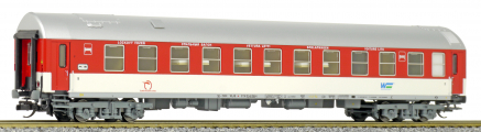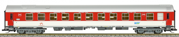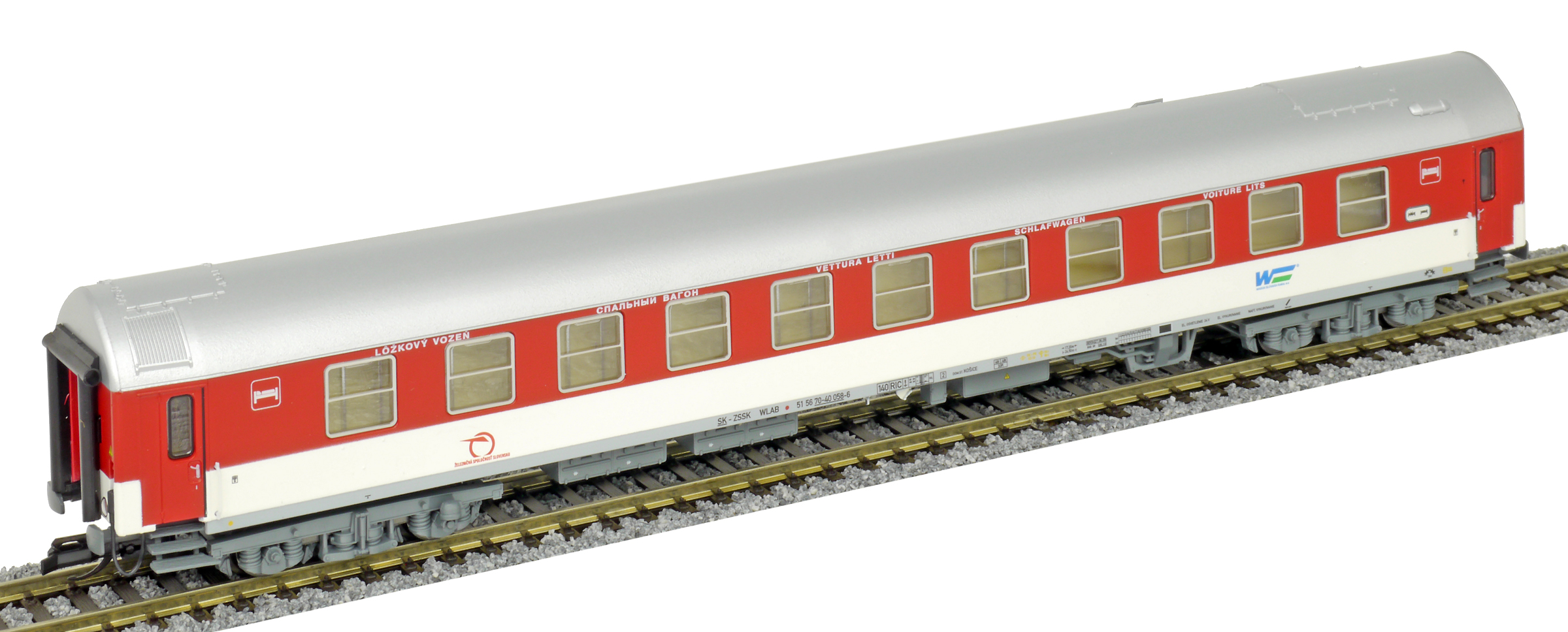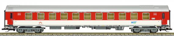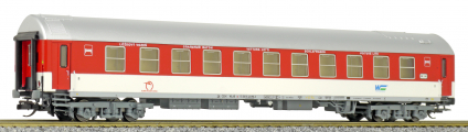 | lůžkový vůz červený-bílý se stříbřitou střechou |