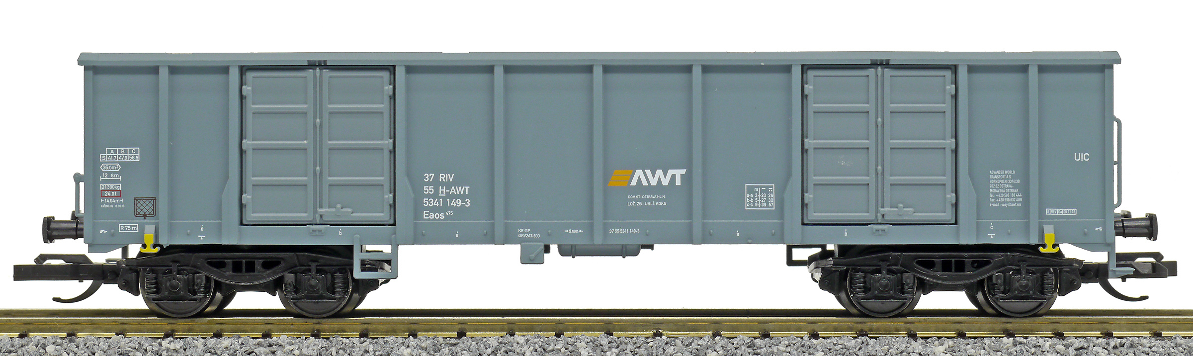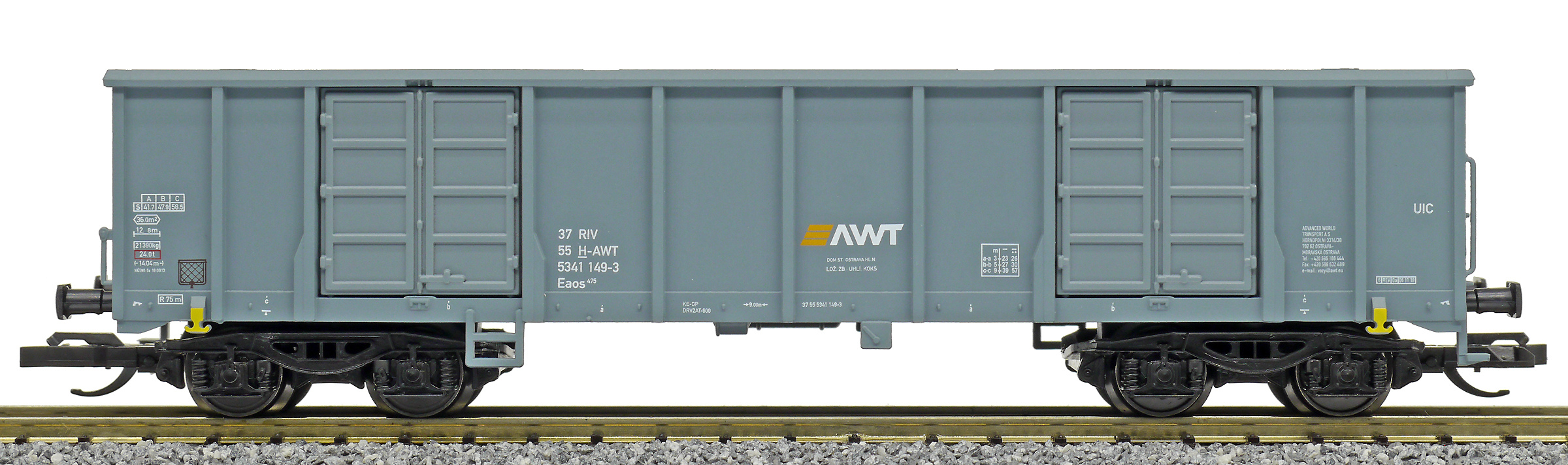 | vysokostěnný nákladní vůz šedý s logem „AWT“ |
