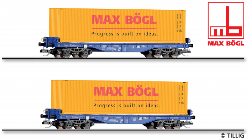 | plošinový vůz modrý s nákladem kontejneru 40' „MAX BÖGL“ |