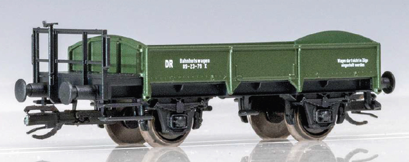 | nízkostěnný nákladní vůz tmavě zelený s brzdařskou plošinou |