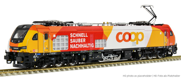 | Stadler Dual-Mode lokomotiva s reklamním potiskem „SCHNELL-SAUBER-NACHHALTIG“ |