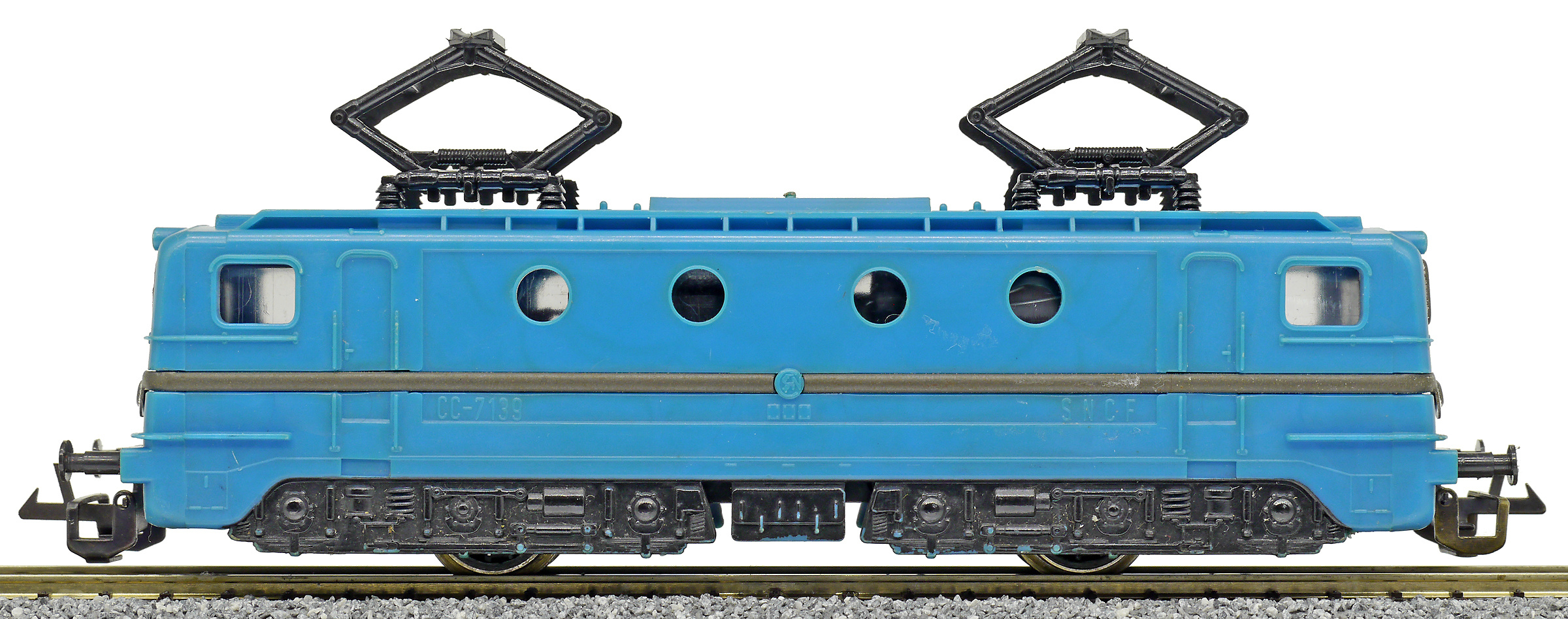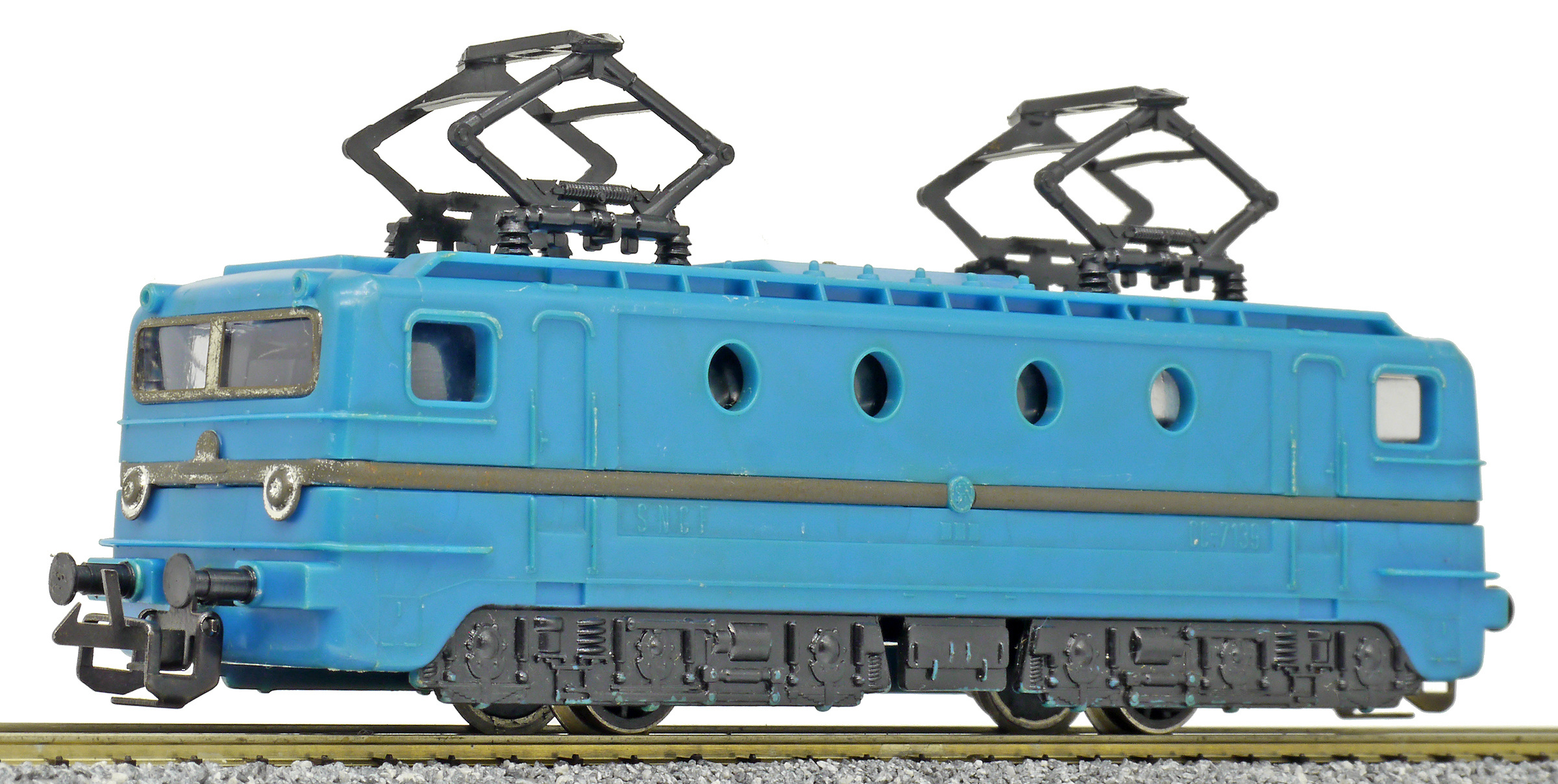 elektrická lokomotiva, různé barvy plastu, černé plastové pantografy a černá imitace pojezdu