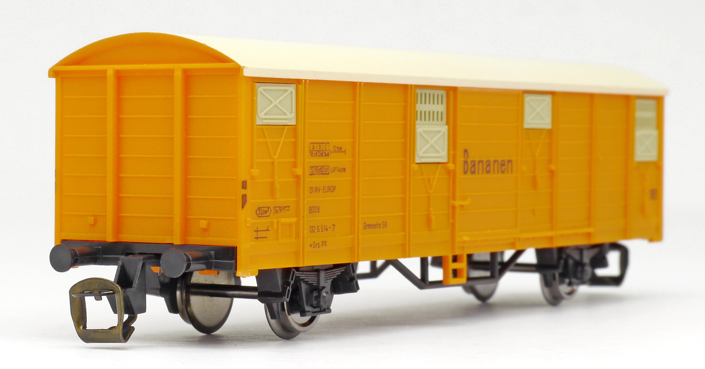 | krytý nákladní vůz oranžový s krémovou střechou a s oranžovými vraty „Bananen“ |